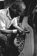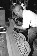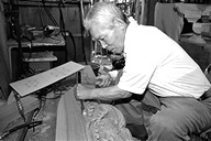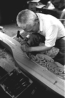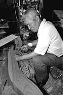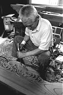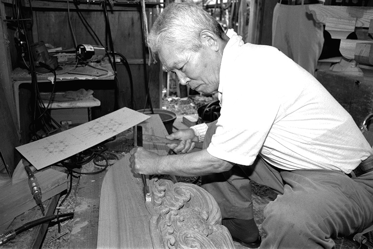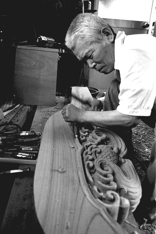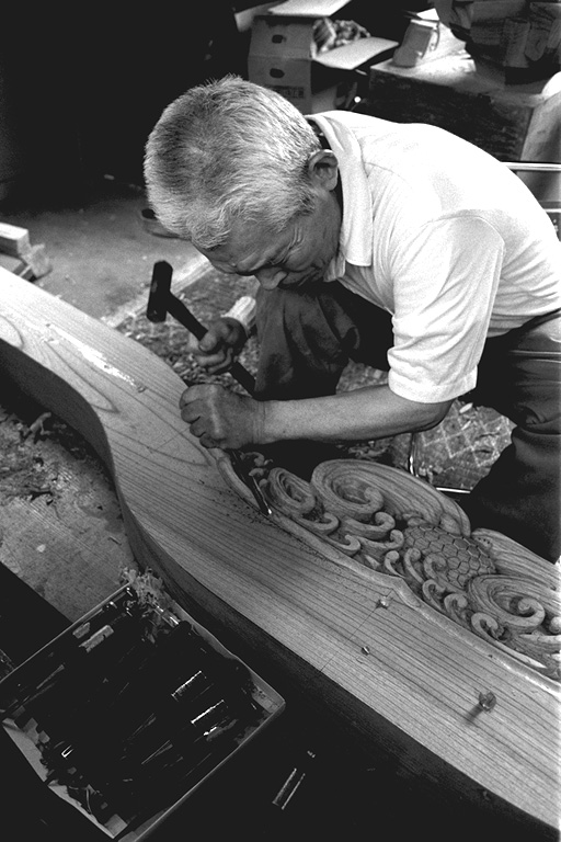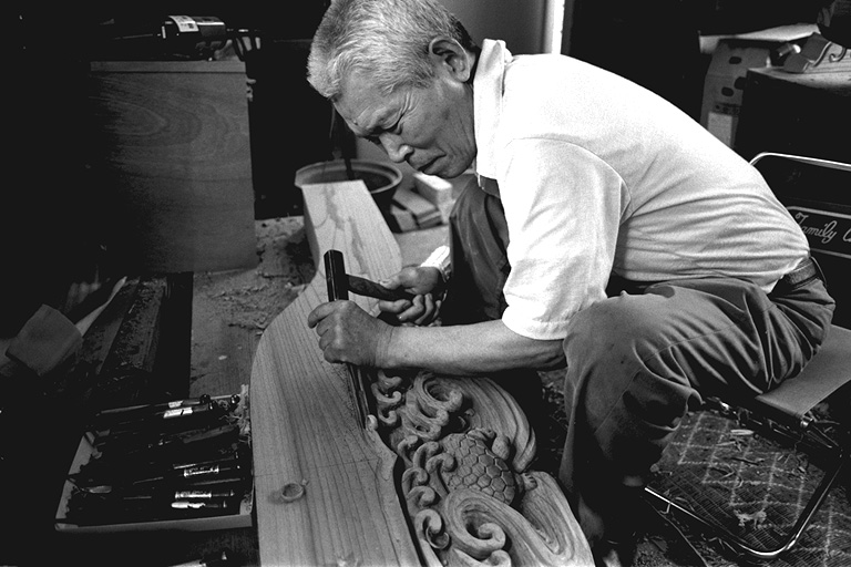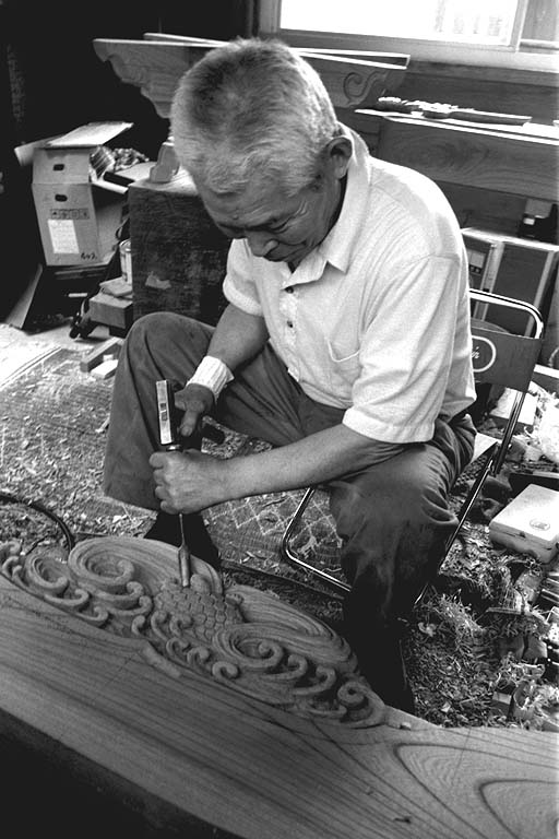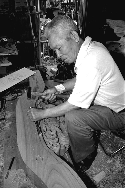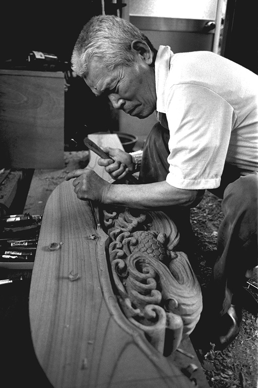 安楽寺、常楽寺といった名刹、古刹がひっそりたたずむ別所温泉−。その一角に、西島さんの仕事場がありました。「別所の宮大工」といえば、ピンとくる人も多いはず。今、手がけているのは、相染閣前に建てる地蔵堂。「これは、その唐破風の部分でね。正面の門の上に取りつけられるもんですわ」と、のみを握りながら話す西島さん。その面持ちやしぐさは、とても80歳とは思えぬほど、かくしゃくとしていました。