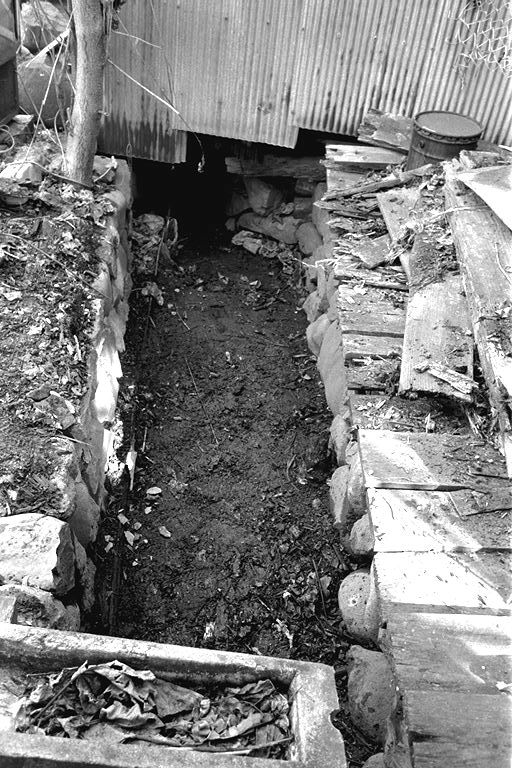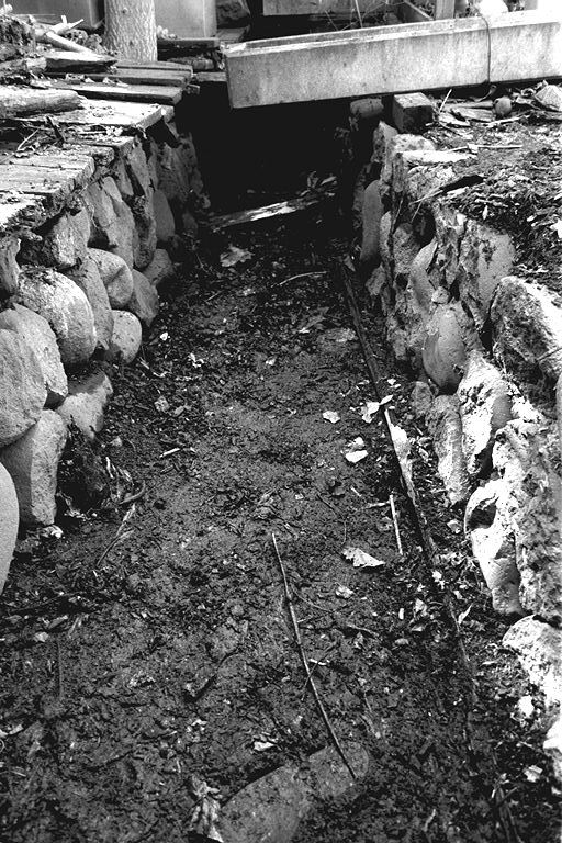 弘化4年(1847)の善光寺地震は、上田の町にも被害を及ぼし、井戸水が止まったことが今も伝えられ、絵図も残っている。当時上田藩では、急遽新しい堰を掘り、神川から取り入れた水を生活用水として城下町へ引き込んだ。その一つの「常田堰」は常田村を経て横町へ流入し、そこで4つに分かれたが、常田町(現在の本町)と海野町裏間の約76m(42間)の水路跡は今も残っている。この水路は横町と常田町(本町)の境で、武家屋敷と町屋の境でもあった。水路は石積みで縁取られ、幅・深さとも各60cmで、一部分80cmから1mの箇所もあり、露出された約5mを、柳屋駐車場の一角に見ることができる。 (撮影日:平成05年12月)