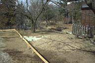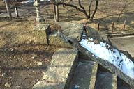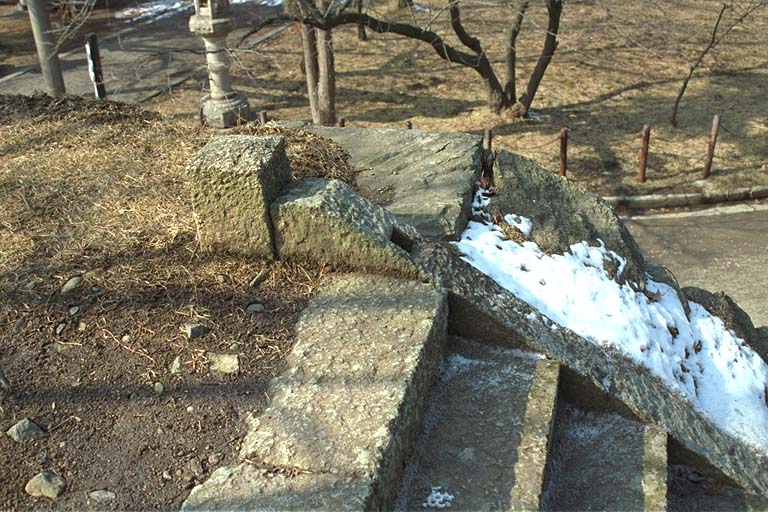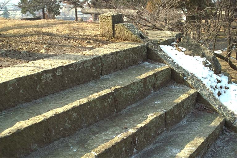 石工事 施工に先立ち、石材見本を提出し監督者の承諾を受ける。礎石、地覆石等は不陸のないようにモ ルタルを用いて据え付ける。モルタルしろは3cm程度とし、丁張に合わせて通り良く引き通す。櫓門礎 石に限って、据え付け完了後、石廻りをコンクリートで根巻する。袖塀土台については特に基礎工事 は行わず、既存の石垣天端石にヒカリ付けで据え付ける。土台と石垣の隙間が大きい部分には差し 石を嵌め込む。 (撮影日:平成05年02月04日)