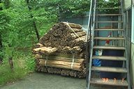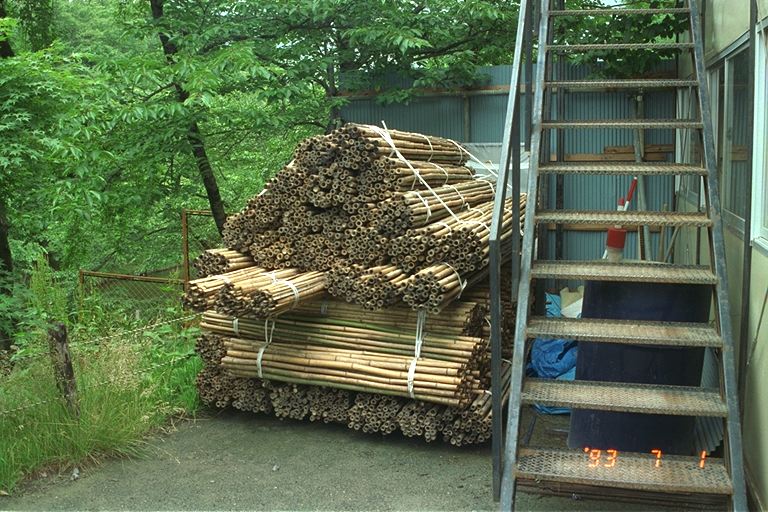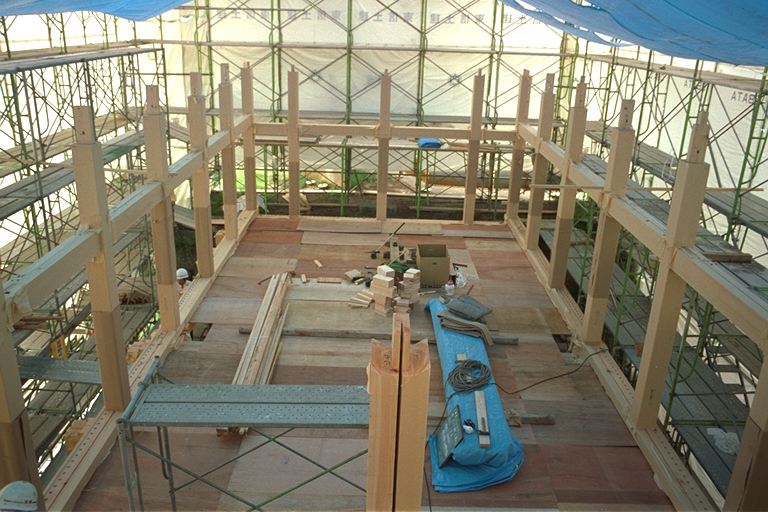 材料加工 材料は設計図書に従い材料検収に合格したものを使用する。加工は原則として工場で行い、仕上 げ養生(天然フノリ紙貼りの上ダンボールまたは2.7mmベニヤ)したものを現場搬入し組み立てる。 (撮影日:平成05年06月14日)