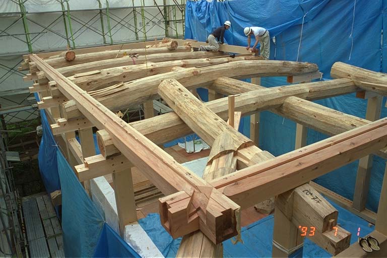 下層軸部は台桧を用いる。原木より製材して乾燥させた材料を使用し、加工は帯鋸、手押し及び自動鉋盤で材料の通り、矩手及び形状寸法を調整した後、墨付けする。次に継手仕口等の加工を行い、必要に応じて仮組した後、鉋仕上げを施す。なお、木口には割れ止め用にクリアーラッカーを塗布する。上層軸部は桧及び赤杉を用いる。加工方法は下層軸部と同様とする。下層軸部、小屋組材のうち梁材は松丸太を用いる。加工はまず手斧等で荒削りし、墨付けする。次に継手仕口等の加工を行い、必要に応じて仮組した後、手斧で仕上げる。小屋組材のうち梁以外については赤杉を用いる。加工方法は下層軸部に準ずる。