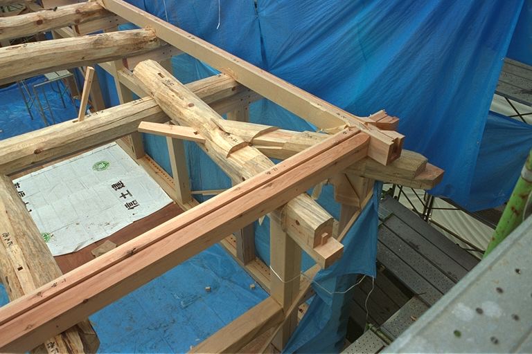 軒廻り材及び野地材は赤杉を用いる。反りものについては原寸図より作成した型板を使用して墨付けする。その他加工方法は下層軸部に準じ、見え掛り化粧材には鉋仕上げを施す。懸魚ほかの彫刻を行う材料は台桧を用い、原寸図に従い製作する。造作材及び床板は、桧を用いる。本体軸部との取り合わせのため、仕口等及び仕上げは現場で行うものとする。下見囲い及び狭間には赤杉を用いる。加工方法は軒廻り材に準ずる。袖塀の見え掛り柱及び貫は桧を用いる。加工方法は下層軸部に準ずる。その他の袖塀部材は赤杉を用い、加工方法は軒廻り材に準ずる。