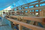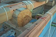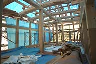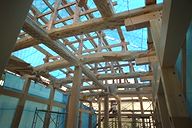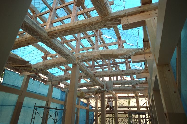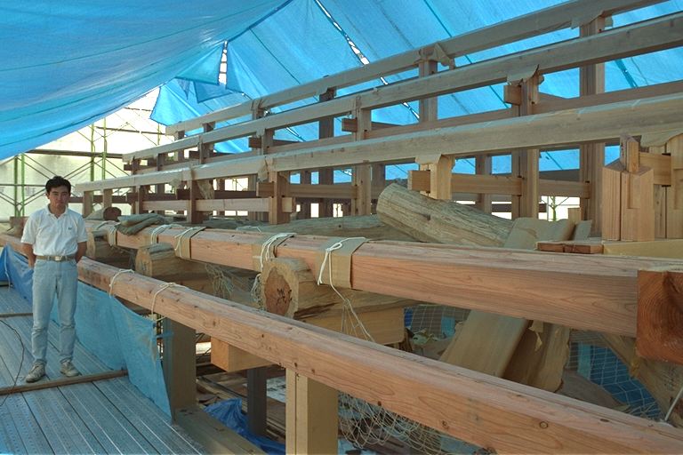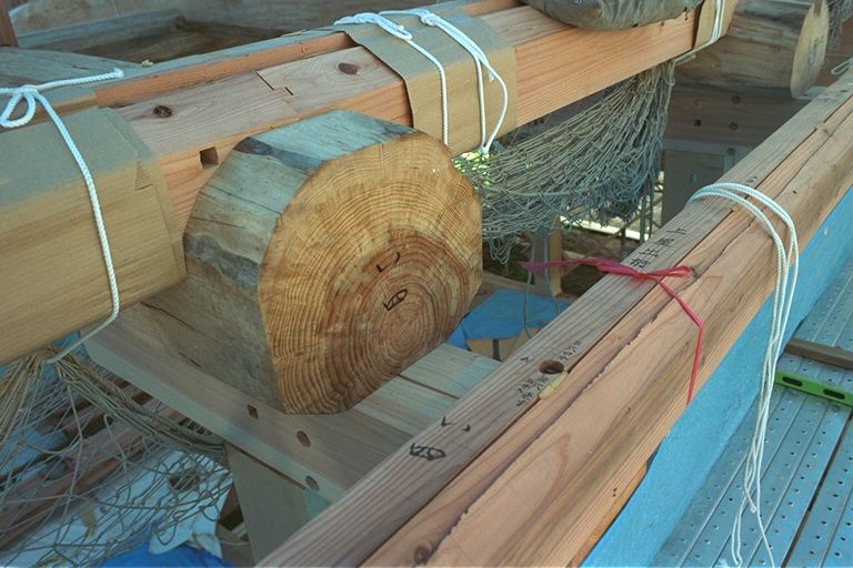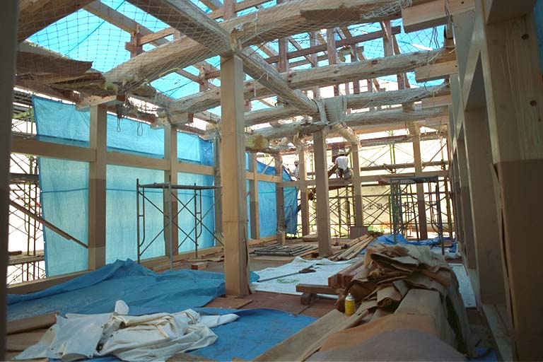 建方は、立水、不陸調整して行う。柱根本等と礎石の間には2mm厚の鉛板を敷き、 石当たりの部材はヒカリ付けを行う。建方終了後はベニヤ板で養生する。