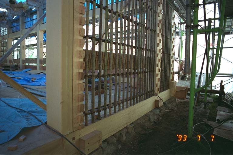 櫓門上層・袖塀壁面、各軒裏は丸竹下地、腕木上、垂木等は巻縄下地とし、櫓門外面及び袖塀は大壁仕上げ、櫓門内面は真壁仕上げとする。ただし、下見囲い内面は荒壁仕上げとする。