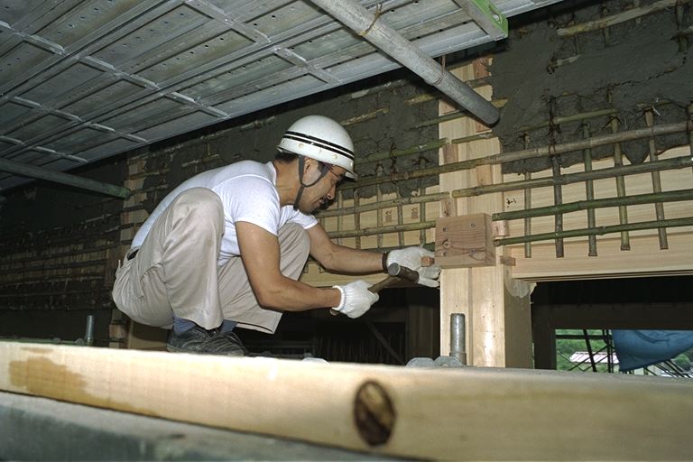 下見囲いの取り付けは、荒壁塗の後に行う。引き続き上半の中塗りを行えるよう骨組みとなる材料を先に取り付け、腰板及び簓子は荒壁の乾燥を待って行う。