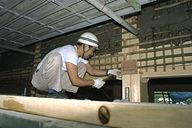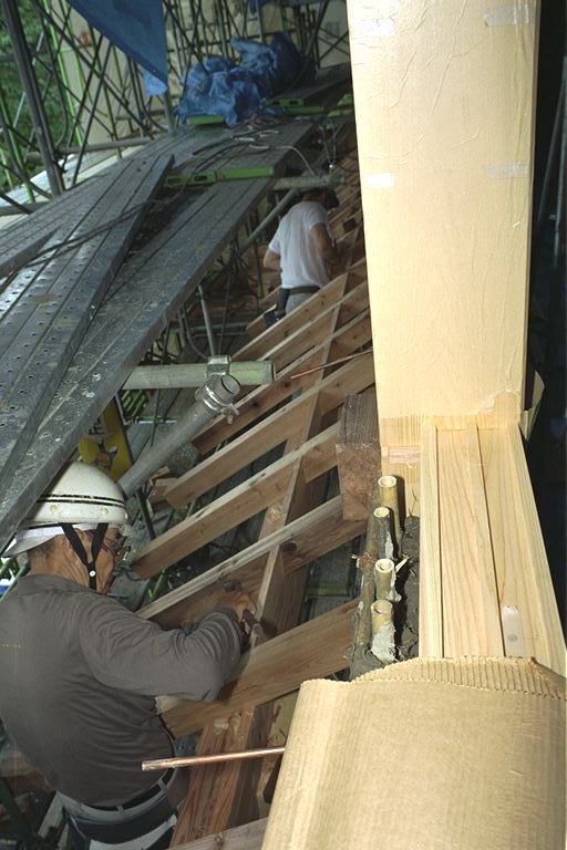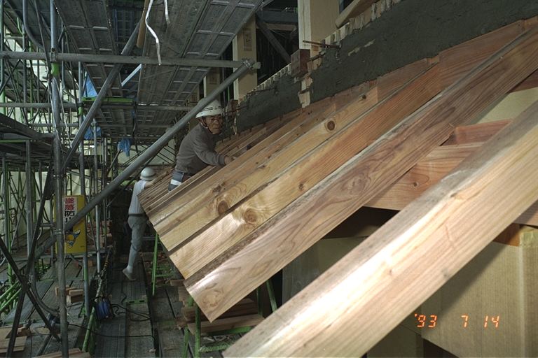 瓦工事の前準備としては、野地完了後、瓦施工者の瓦割付けに従って瓦座へ瓦繰を行い、土居葺き終了後に空葺き用瓦桟の取り付けを行う。下層庇については、葺下地銅板のため、野地板へ瓦桟を打つものとする。