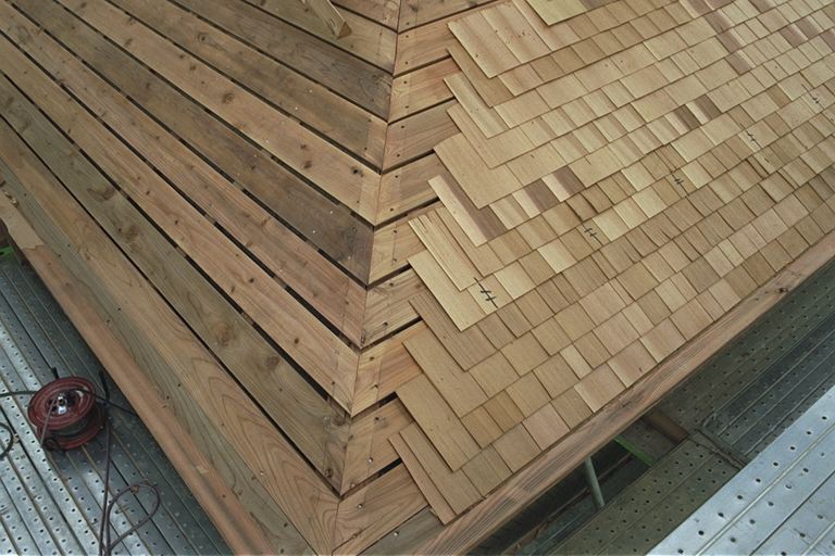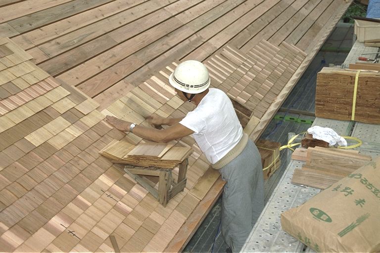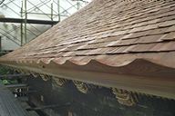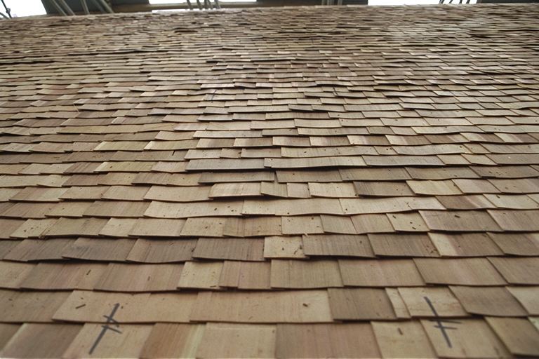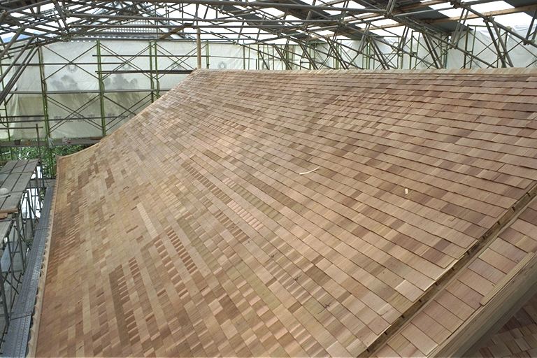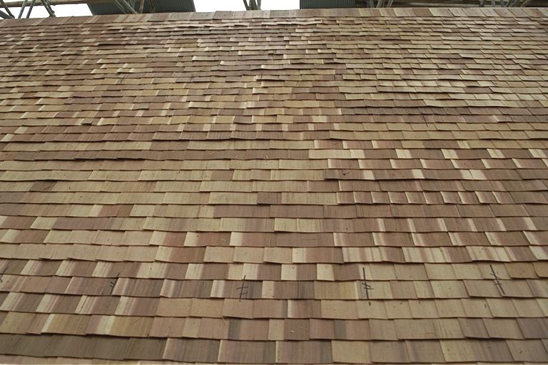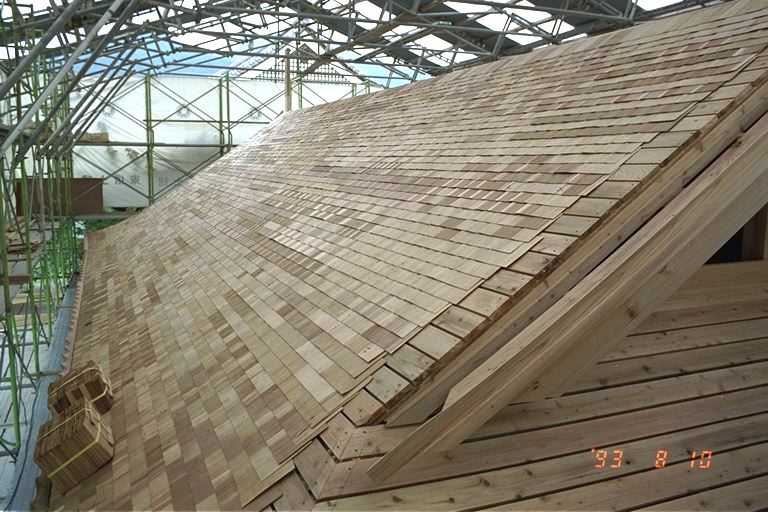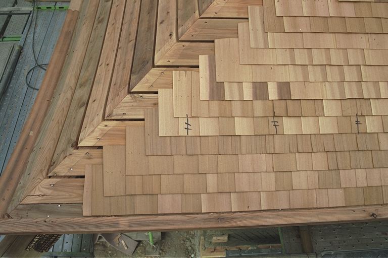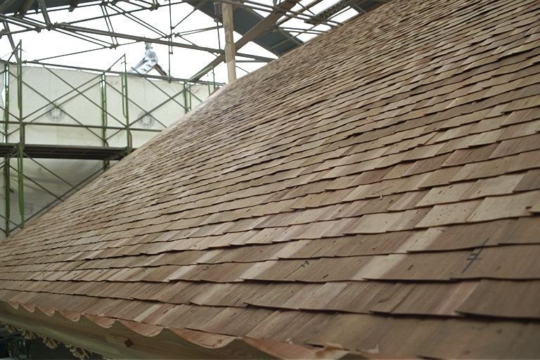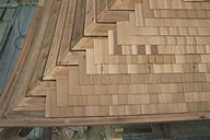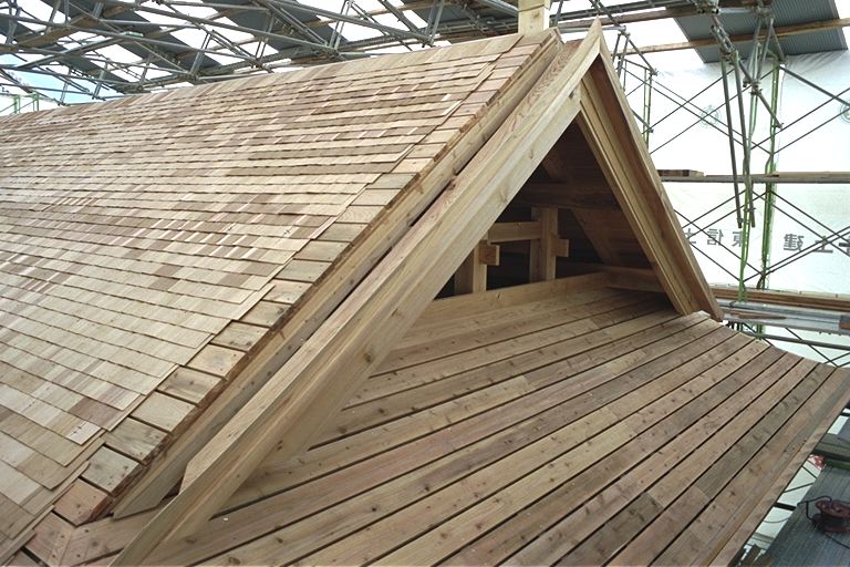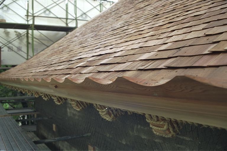 土居葺板 長8寸、幅3.5〜5.0寸、厚0.1寸以上、米杉柾目割板、赤味勝材