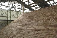 屋根漆喰 石灰20kg、角又9.4kg、麻すさ11kg、大豆油0.18kgを調合し、充分練り返したものを使用する。施工箇所は各鬼瓦裏及び棟積みの短冊漆喰に用いる。