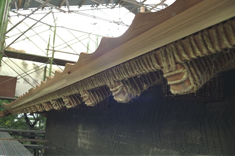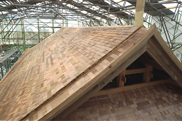 櫓門、袖塀とも本瓦葺きとし、土居葺きで施工する。平瓦は空葺きで施工し、平丸別葺き法にて葺き上げる。