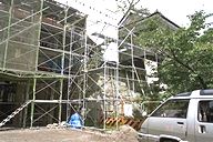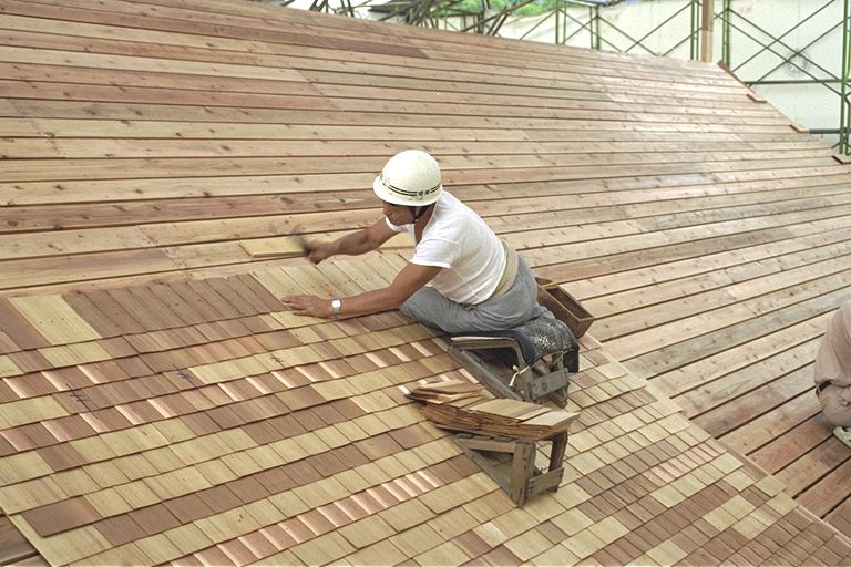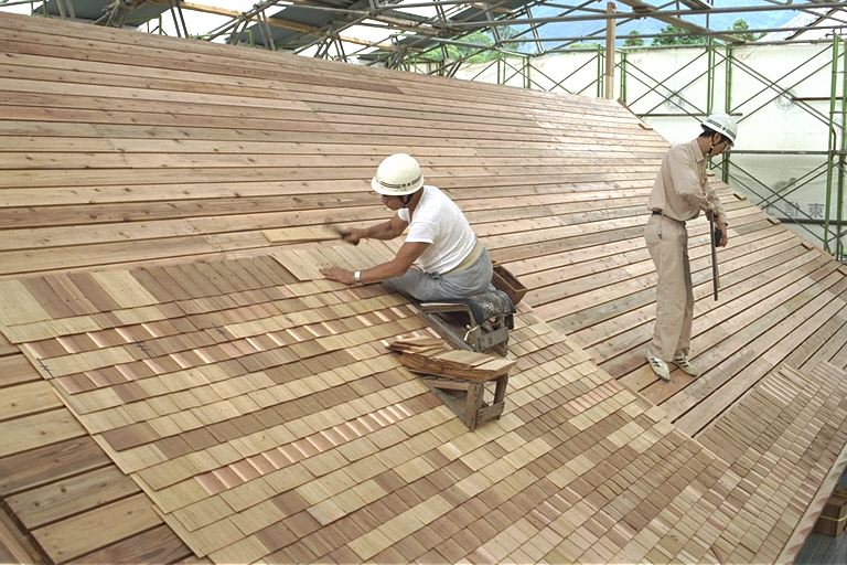 瓦 見本瓦及び原寸図に倣い、見本品の検査後、製品の焼成を行う。原土は最良質の粘土を用いて充分練り立て、艶消し仕上げとする。焼成温度は1,200℃以上とし、亀裂変形がなく、形状揃い、光沢一定したものを使用する。南蛮漆喰 調合は石灰20kgあたり、川砂0.11立方メートル、角又8.4kg、マニラすさ11kgとし、充分練り返したものを使用する。