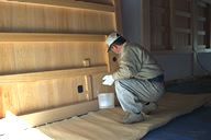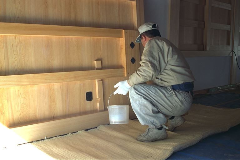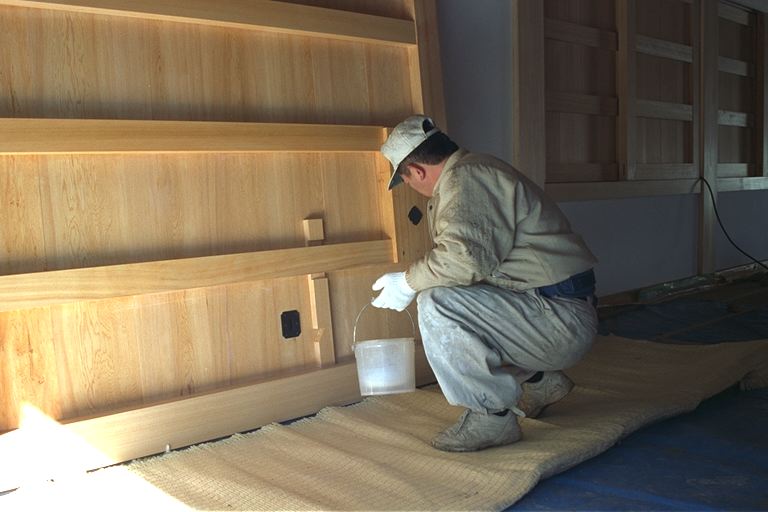 美装工事 内部木部は水洗い、しみ抜きの上、ワックス2回塗りとする。