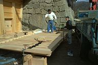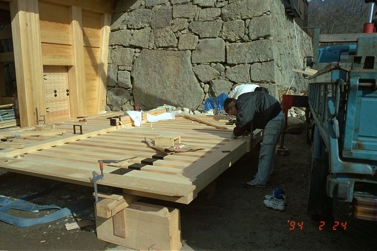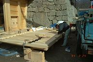 建込み 下層大扉及び潜扉は、現場搬入後、肘壷、唄、閂等金物の取り付け及び調整を行う。上層白土戸は、溝切り込み、柱戸あたり等とのすり合わせ調整を行う。
