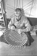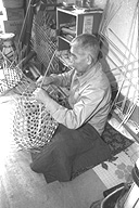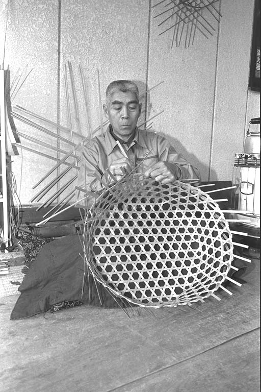馬場町通り、少し脇に入った場所にある井出竹細工商店。主人の井出さんは2代目で、この道45年。「今までに注文に応じて、いろんなもんを作った」と語るように、米上げざる、目かご、すだれ、そばをのせるざる、青竹の置き物のほか、珍しいものでは、運動会の大玉送りに使うかごなども。材料の竹は、おもに大竹と呼ばれる竹で、井出さん本人が塩田や川西方面の山から直接切り出してきます。「昔は7〜8軒あった竹細工屋も、今ではうち1軒になっちゃいましたよ」と。しかし、作業中は、「作るものを頭に描いて、竹を切らなければならないので、材料作りがたいへんなんですワ」と目を輝かせながら語るところに、竹を愛する井出さんの人柄がにじみ出ていました。