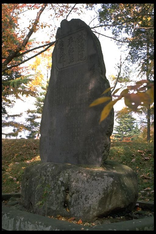 上田公園内本丸跡地の土塁の斜面に東から白雄の句碑、六川水声の句碑をはさんで、新田義徳の碑、その西隣が渡辺平和殉職碑。