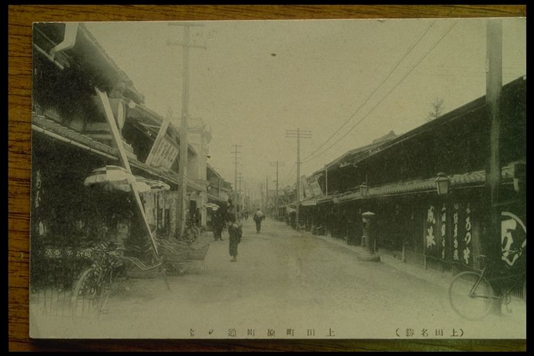 明治末期の原町の様子。電線と電柱が見られ、すでに電灯が入っていることがわかる。手前の自転車も珍しい。自転車が日本に初めて入ったのは明治3年。上田では同23年が最初だという。(写真提供=若林勅滋さん)