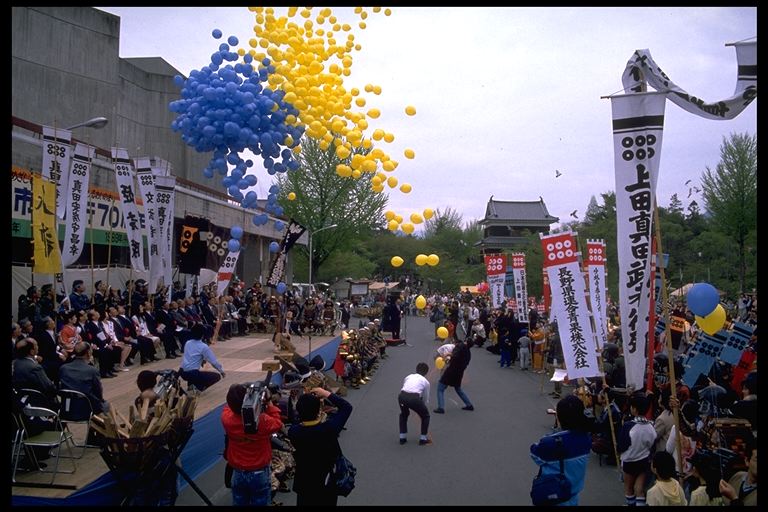 上田公園で市制70周年記念事業の開幕を宣言した後、小学生の鼓笛隊、上田市と姉妹都市の代表を乗せたオープンカーなどが真田武者行列と一緒に目抜き通りをパレードしました。