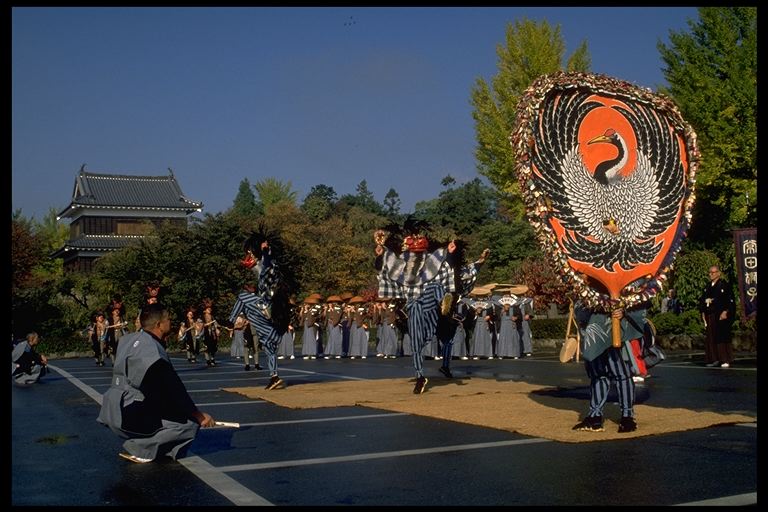 市制70周年記念式典前、常田・房山獅子の舞いが披露され、祝賀ムードを盛り上げました。(写真は常田獅子)