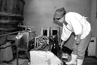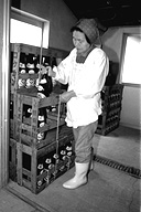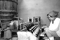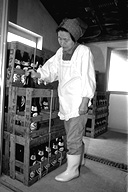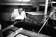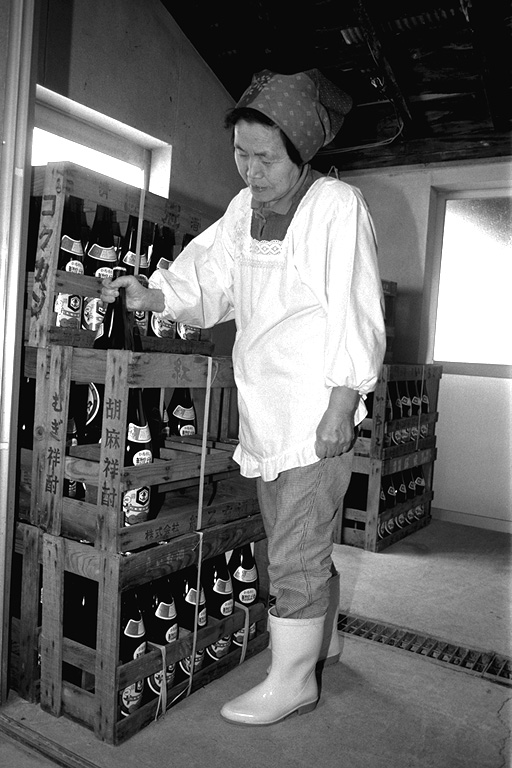 下組公民館の近く、大きな煙突がそびえ立っている場所が信州味噌醤油醸造。作業場は生醤油のとても良い香りが立ち込めています。「なんとなく懐かしいにおいがするでしょう」と、にこやかに話す松崎さん。現在は、奥さんの茂子さんら家族6人で作っています。ここの醤油の特徴は、なんといっても添加物が入っていないこと。「調味料が入っていないから、口に含むと塩辛く感じるんですヨ」と語る反面、こんなことも。「昔の味に慣れてる人にはいいかもね」。