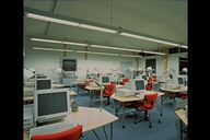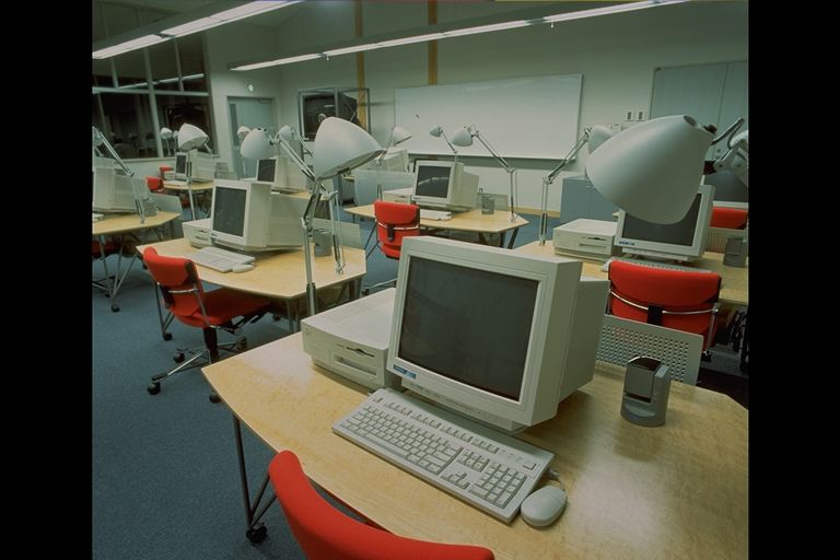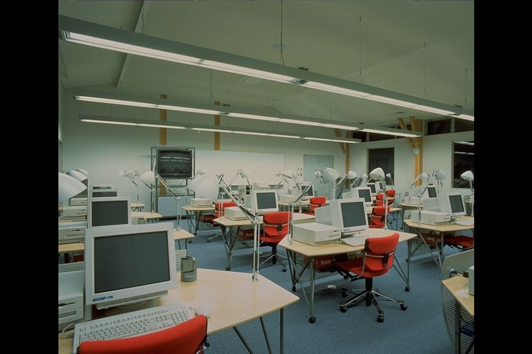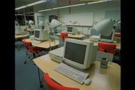 セミナールームでは、静止画の編集・加工、三次元CGやマルチメディア・タイトル制作などをテーマに最大40人のセミナーや研修会を開くことができます。講師用パソコンと受講者用の20台のパソコンはネットワークされ、実習や講習を効率よく進められるようになっています。なお、ネットワークは高速の光通信システムを採用しているので、目的や用途に合わせてテーブルのレイアウトを変更することもできます。