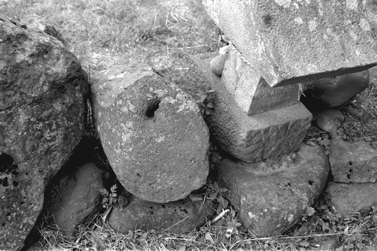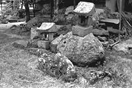 写真の向かって左側が夫婦道祖神、真ん中のほこらが天神様、右側が豊受大神と呼ばれているほこらです。天神様と豊受大神の間に横たわっている石が「鳴石」といわれているものです。石には金属棒であけたと思われる穴があいていて、それが向こう側まで貫通しているんですよ。昔からあったもんだから、子どものころなんかは、石の穴に口をあてて笛のように吹いて遊んだりしたものです。これは、時代はよくわかりませんが、神に祈願する庶民の風習だったそうで、珍しい石ですよね。