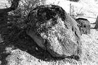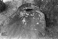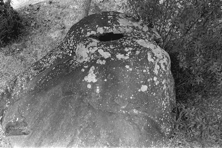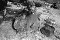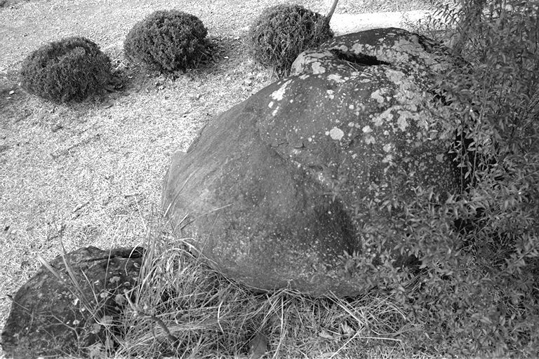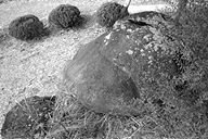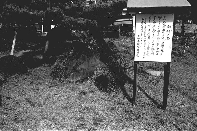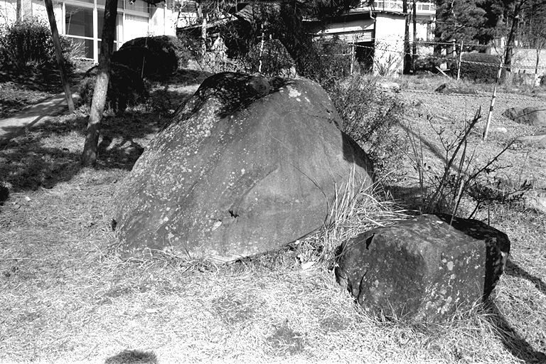 この石は現在、市民の森・わしば山荘の入り口に置かれています。深さがどのくらいあるかわかりませんが、水がたまっており、どんなに日照りのときでもかれることがないそうです。市民の森周辺は、今でこそ一帯が森林になっていますが、以前は小さな雑木しか生えておらず、明治の末ごろは草刈り場でした。昔、この辺りではどの家でも牛馬を飼っていて、えさになる草をこの草刈り場で調達したものです。だから当時の人たちは、草刈り鎌をこの鎌研ぎ石で研いだのではないでしょうか。