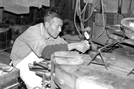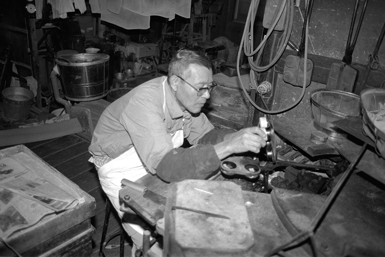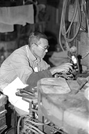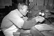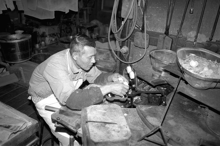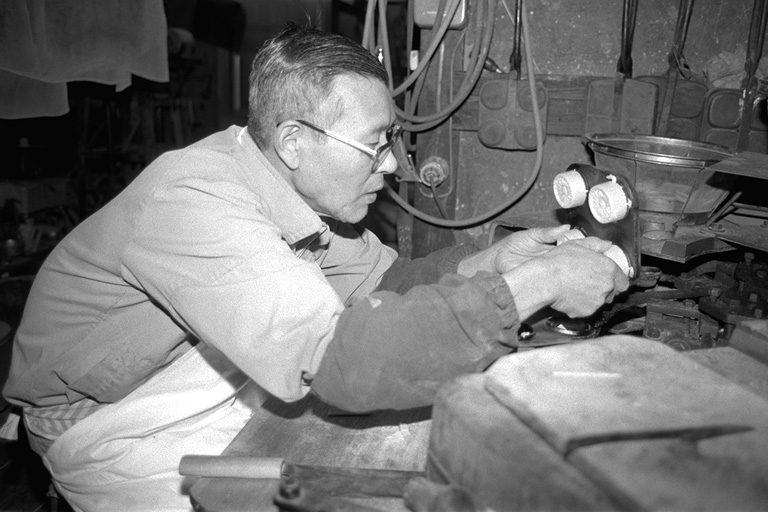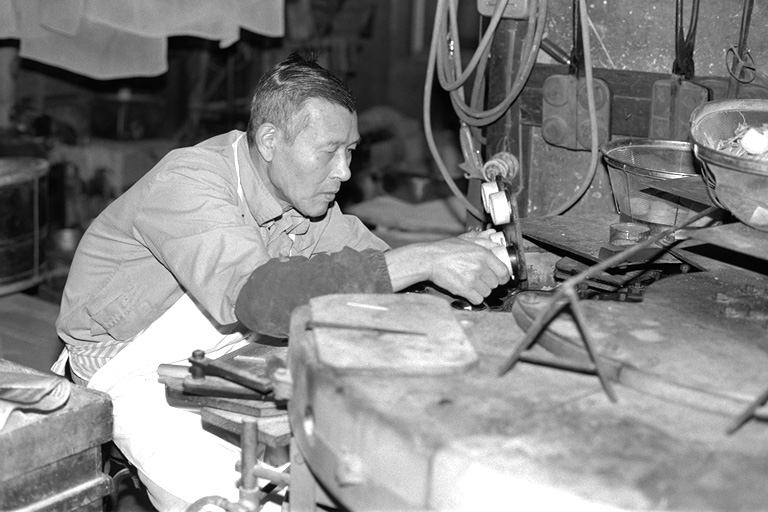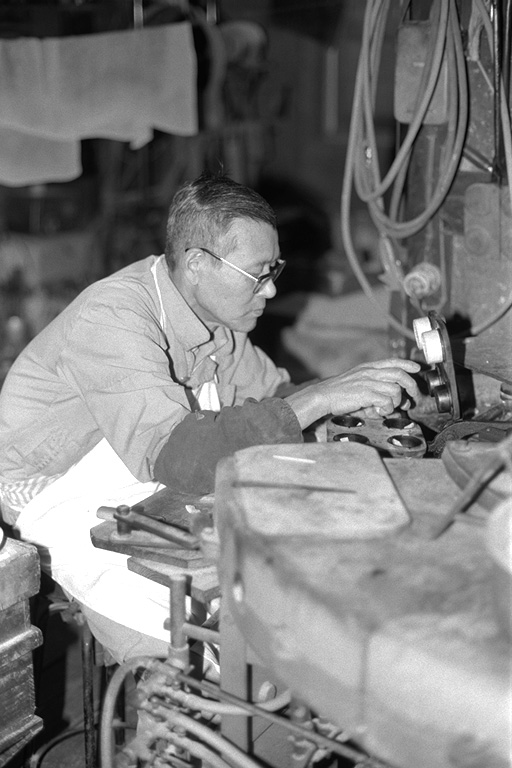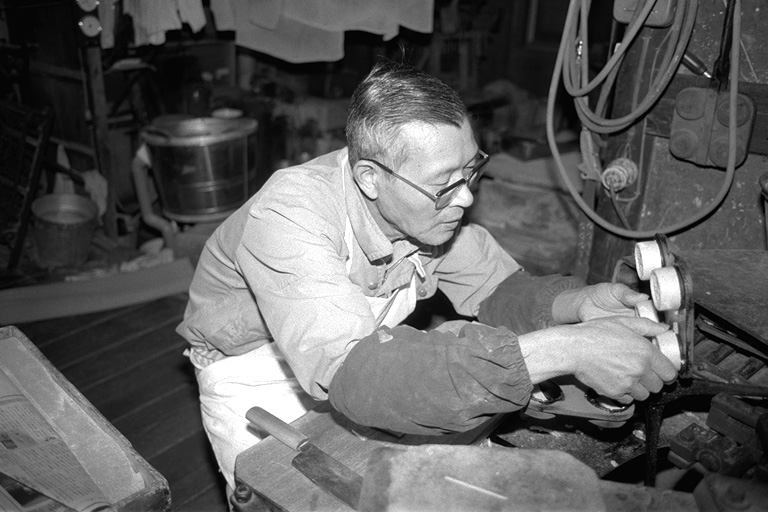 もなかの皮は、薄くのばした「もち」を裁断し、それを型で焼いたものです。石田さんは「焼くのは『慣れ』のようなもの。いちばんは原料が勝負」と。厳選されたもち米を使う石田さんは、原料にはとても気を配ります。機械は「火床」と呼ばれ、型にもちを入れて、焼き上がった皮を型から取るという連続作業が約半日。「終わるまでは手が離せません」と石田さん。