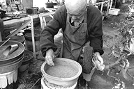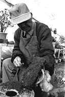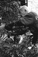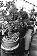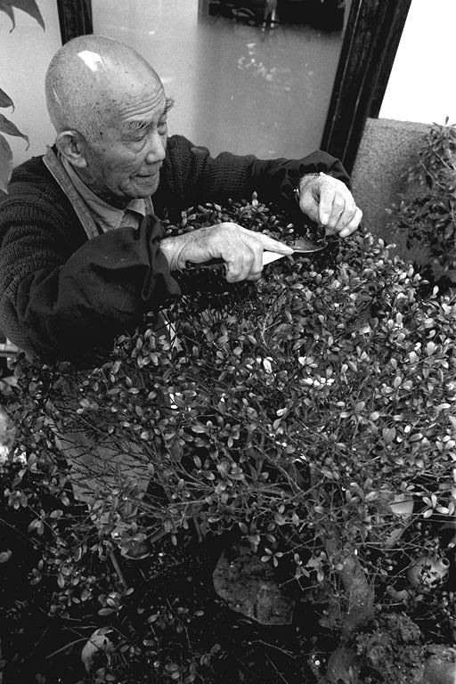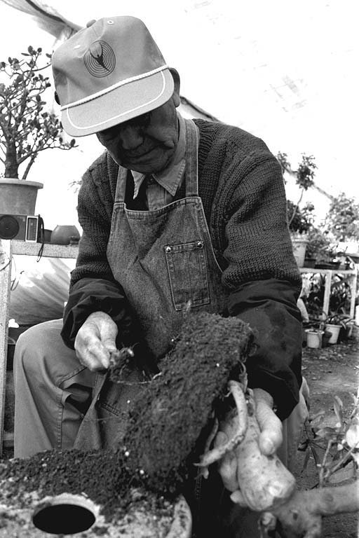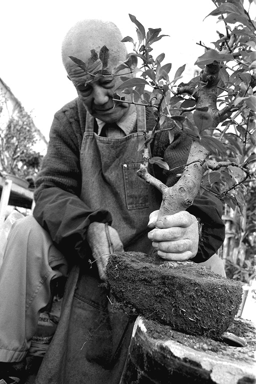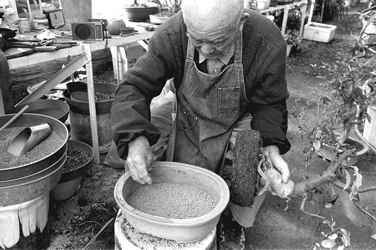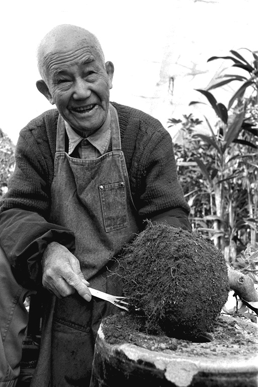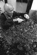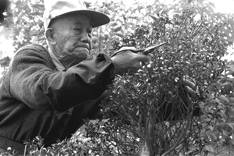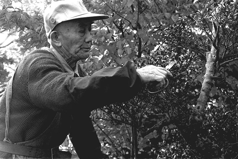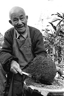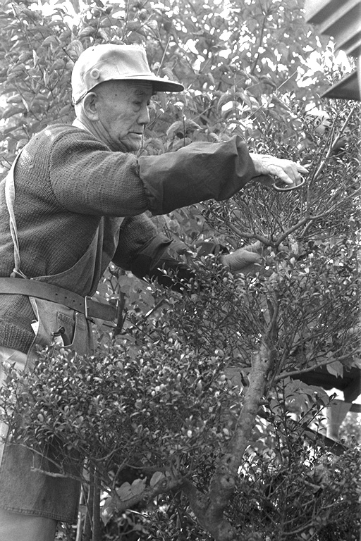庭師とは、今では広い意味で造園業などとも呼ばれています。仕事の範囲は、庭を造る造園、庭を引き立たせるための植栽、そして庭や植栽の手入れなどです。この手入れの仕事の中に、庭木の剪定や鉢植えの植え換えがあります。剪定とは、余分な枝を整理して切ること。「庭木をきれいにする仕事だから、切った枝の後始末までも仕事のうち」と山嵜さんは、庭師の心掛けを語ります。
