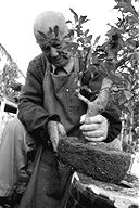 パチンッ、パチンッと秋空の下、木ばさみの歯切れよい音が響きます。家業の庭師を継いで三代目になる山嵜さんが剪定している木は、ツゲの木。無造作なようで、計算され尽くした、まさに円熟味のあるはさみの動きです。「庭木の剪定は、どこから見ても同じような形に、ということを心掛けているかな」と語ります。