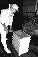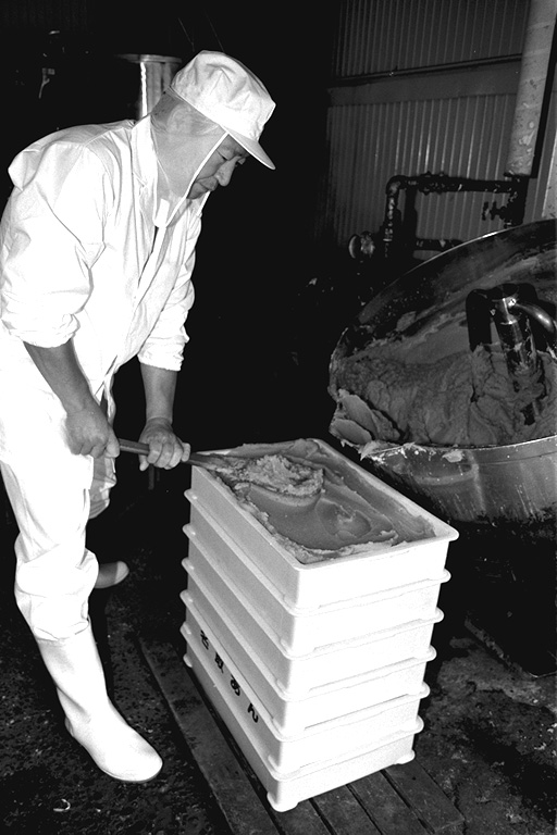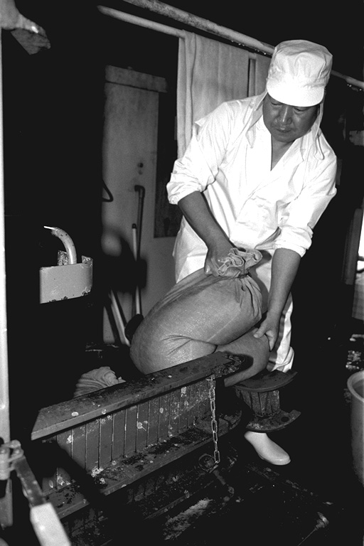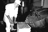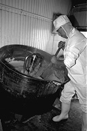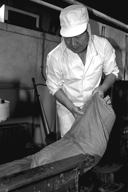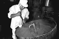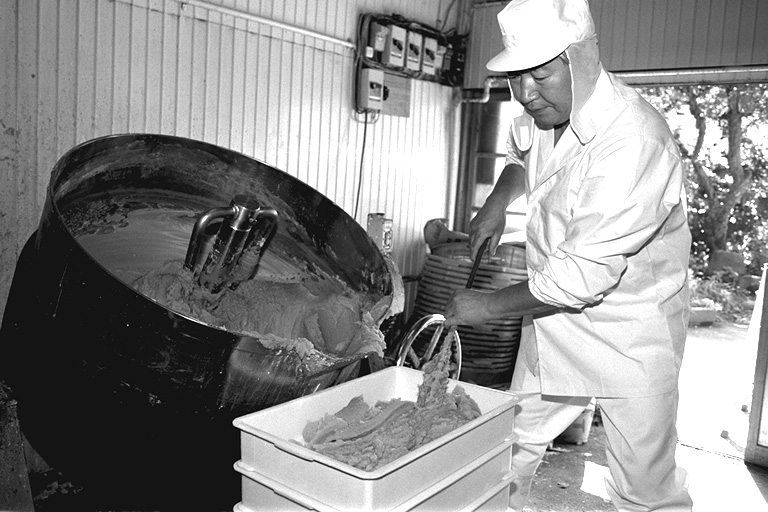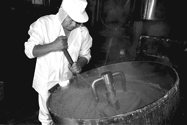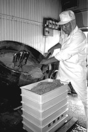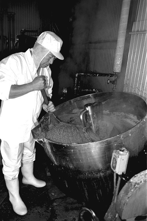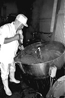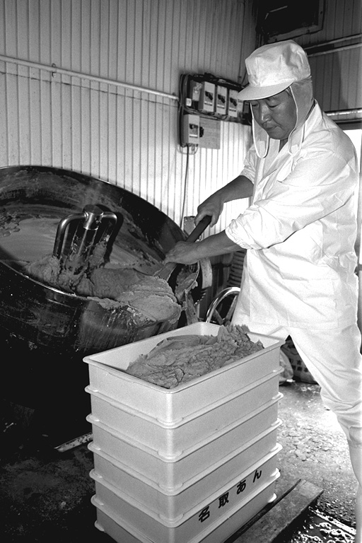 大正時代に創業、三代目になる名取さんは二十六年のキャリア。現在、息子の鉄朗さんほか三人で仕事をしています。作る餡は大きく分けて、生餡と練り餡。「生餡でも、出来上がるまで一日近くはかかるね」と。練り餡だと、これに加糖して練る時間が余分にかかります。「時代の流れで、昔に比べて甘さは控えめです。消費者のかたの舌も肥えてきていますし…」と名取さんは、にこやかに語ります。作業のなかで、名取さんが気を使っていることは、やはり豆の品質と煮上がり。そして「やっぱり食べ物を扱う仕事だから、衛生面ですね」と。現在、豆の量にして、一日七、八俵(一俵は約六十キログラム)相当の餡を市内の菓子店や土産物メーカーに卸しています。