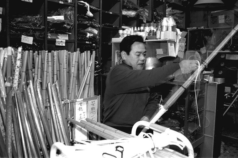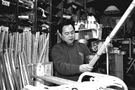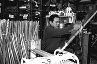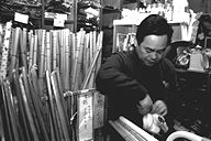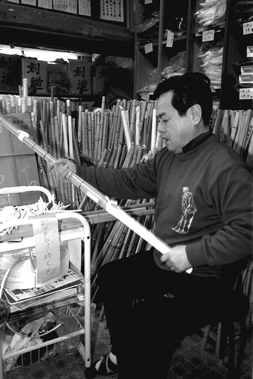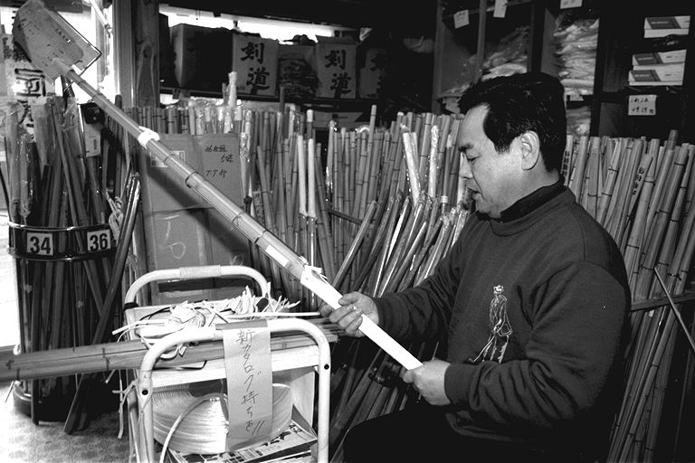 現在は、剣道の竹刀や防具なども外国製が多いそうです。「竹刀は、使う竹も和竹と決まっていて、一本の竹から三〜四本しか作れないんですよ」と佐渡さん。また、防具の胴などに使う革は牛革、甲手(小手)には鹿の革を使います。特に難しいのが面の部分。佐渡さんでも「せいぜい一日二〜三個」と。店には学校関係者や児童・生徒が多いとのこと。終始気さくな笑顔で語ってくれました。