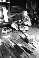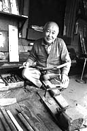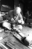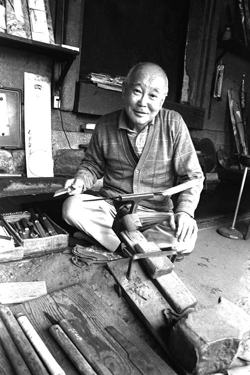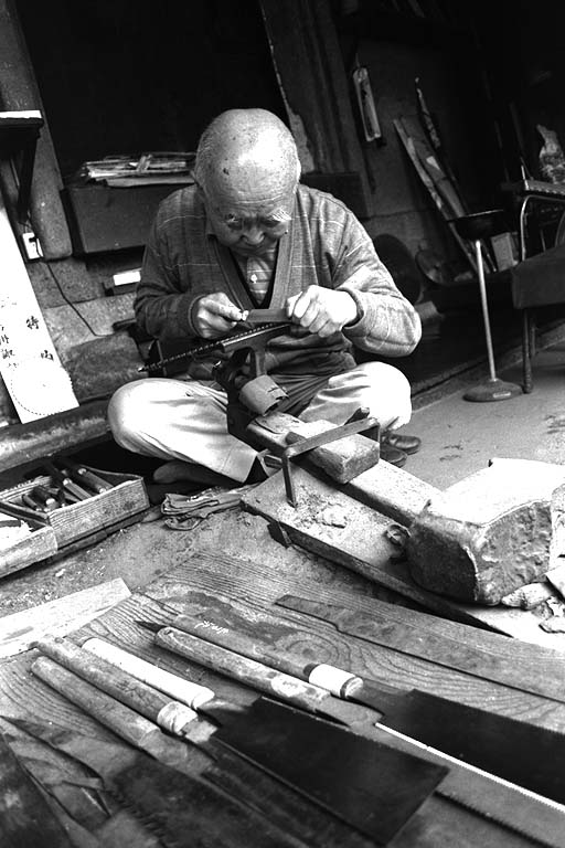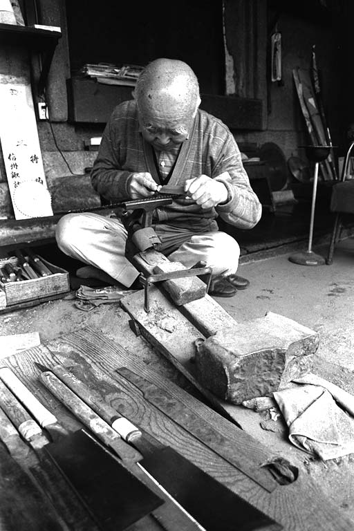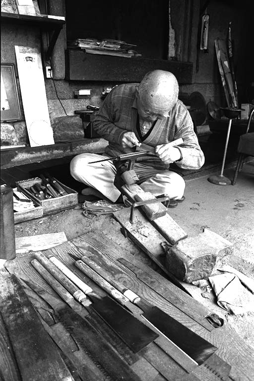 仕事場は、鋸や道具類がぎっしり。タイムスリップしたかと思うほど、そこには昔ながらの「姿」がありました。一人、鋸の目に全神経を集中する今井さん。「鋸も、今は使い捨ての時代。傷んでも修理に出すことは、あまりないね〜」。注文のほとんどは、大工さんからだそうです。鋸自体、需要が減り、使い方すら知らない人が多いのでは…。最近まで、息子さんも手伝っていましたが、外へ仕事に。目立てというのは、「ヤスリで歯を研ぎ、板の歪みを直し、アサリを出す(歯を互い違いに調整する)」一連の作業。それが終わると、まっすぐ切れるかどうか、「木を引いて、確かめるんだ」と目を輝かせます。鍛造も、昭和三十二年ごろまでは、先代の政信さんとやっていました。そして、傍らには、ふいごがそっと隠れるように置かれていました。 (撮影日:平成02年05月07日)