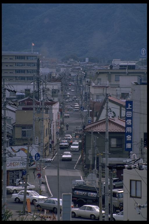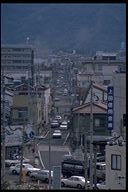 手前が愛宕町の通り、途中から日の出町の通りになる。大正6年から8年にかけて改修が行われ北へまっすぐにのびる道ができた。