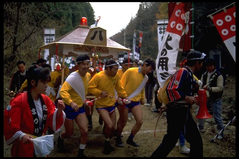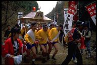れん台に乗った女性を担いで、太郎山一番のりを目指す同ラリーには、30チームが参加。黄金沢の不動滝から太郎山の大鳥居まで裏参道を登って順位を競いました。