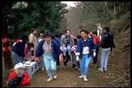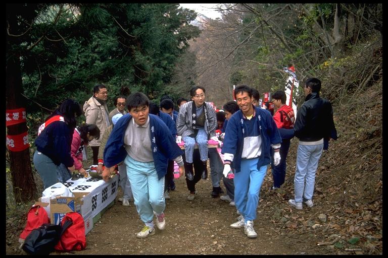 れん台に乗った女性を担いで、太郎山一番のりを目指す同ラリーには、30チームが参加。黄金沢の不動滝から太郎山の大鳥居まで、裏参道を登って順を競いました。