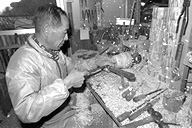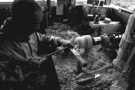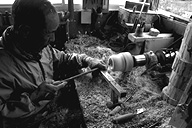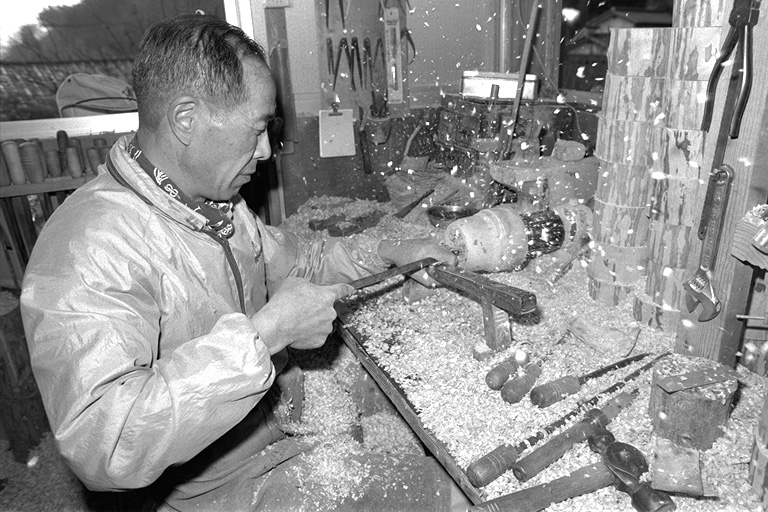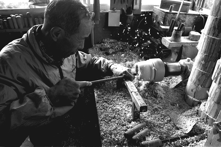 「これは、農民美術で使うハトをあしらった砂糖つぼでねェ」と滝沢さん。ろくろの軸の端にシラカバ材を取り付け、モーターで旋転させ、バイト(刃物)で材を抉り削ります。ひゅるひゅると飛び散る木くず。一瞬一瞬が勝負とあって、「気が抜けない」という滝沢さん。