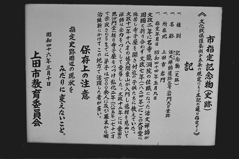 このあたりは、「本城」という地籍で、上田城より古いとされる岩門城の土塁が一部残っています。また、佐久間象山が蒼久保の竜洞院から通いながら学んだ大日堂は、地区の公会堂として利用されています。