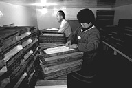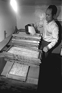 この日は、前日、種麹をまいた蒸し米を、箱へ盛る作業が早朝から行われていました。室の中で、一升づつ箱に取り、一晩寝かせます。すると糀に−。「うちは代々、こうやって箱に取っている。これをしないと、糀の花が咲かない」と目を輝かせる山辺さん。「大量生産にはない、手作りのよさを守っていきたい」とも語ってくれました。 (撮影日:平成03年03月18日)