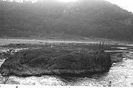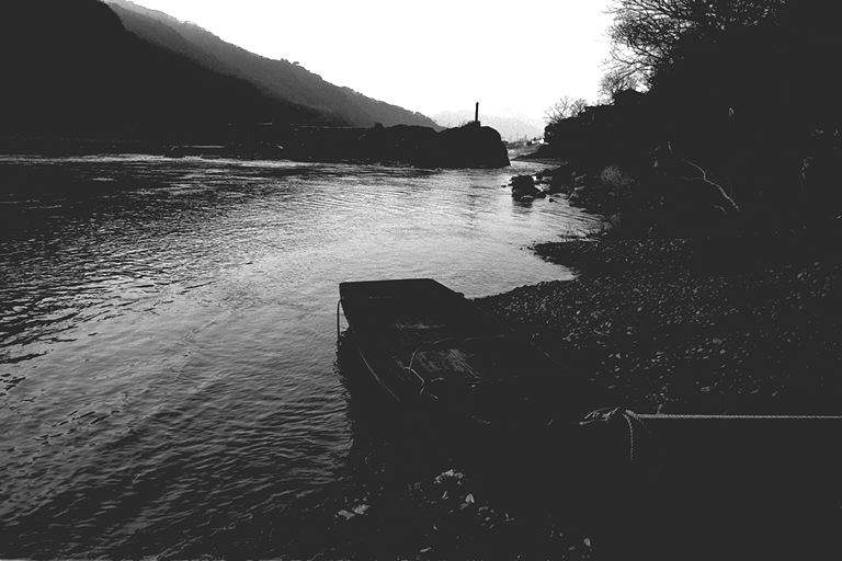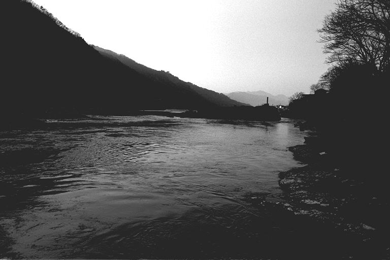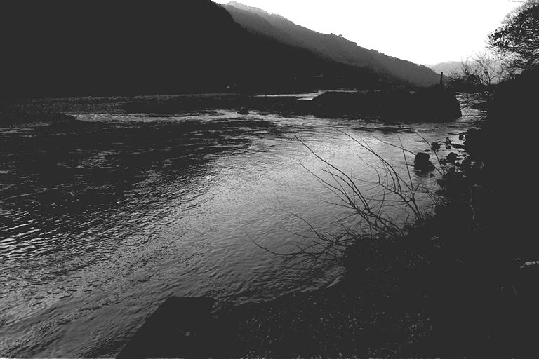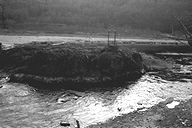 昔は、街道の脇から太鼓岩まで、つり橋が架かっており、岩の上には、つけばの建て物がありました。しかし、いずれも台風や大水の被害で、なくなってしまいました。また、太鼓岩から向こう岸の尾根山までは、渡し舟で行き来を。子どもたちは太鼓岩の周りで、水浴びや釣りをよくやったものです。