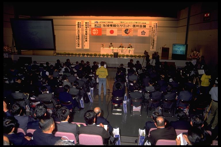 開催地の上田と岡谷市を通信衛星で結び、地域情報化サミット信州会議が秒刻みで同時進行しました。両会場とも地域密着のCATVが活躍。