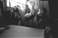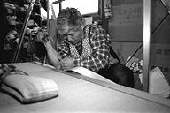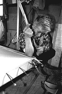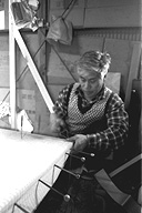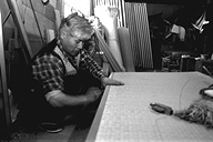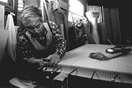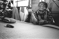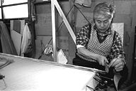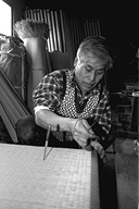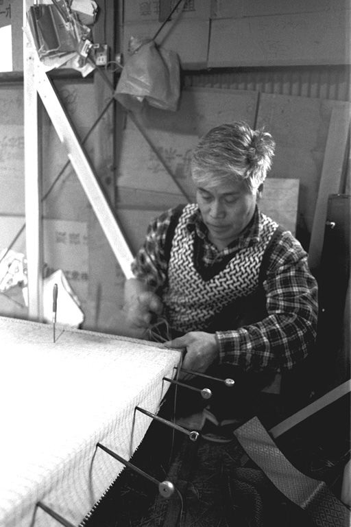 現在、上小地方には約45軒の畳業者がありますが、池田さんもその一人です。3代目になる池田さんは、この道35年。機械縫いの畳がほとんどの現在でも、手縫いの作業もします。「修業時代は、ひじをすりむきながら縫って覚えたもんです」と。手作業で難しいのは「縁」の部分。ひじを当てて縫う作業で「あれは相当に力がいる仕事。慣れないと針が上がらないんですよ」と池田さん。