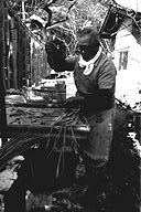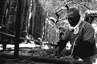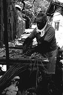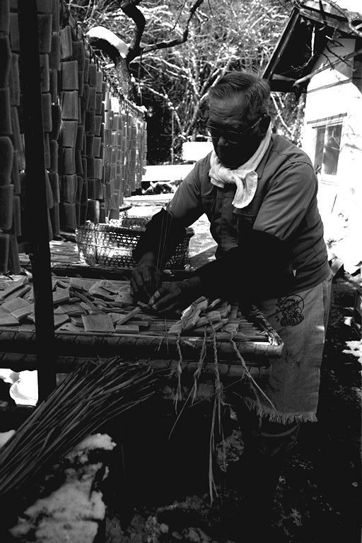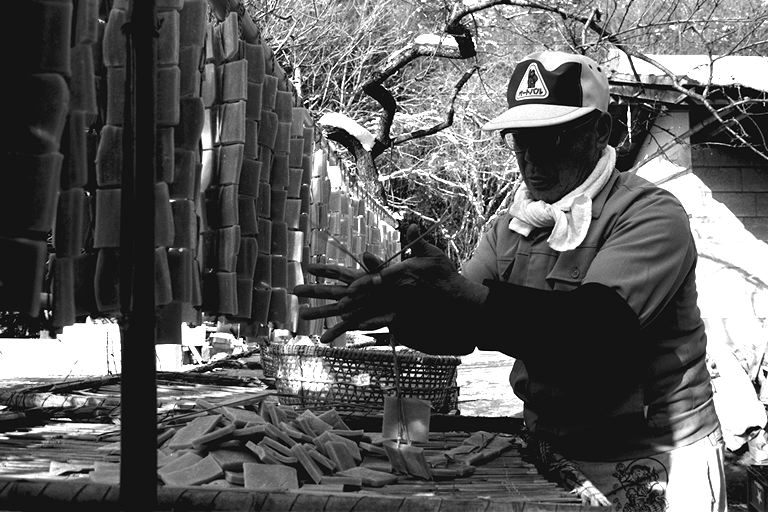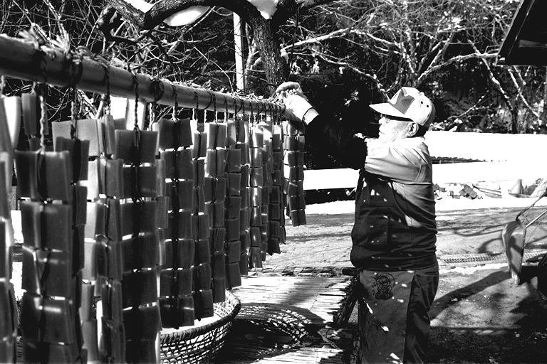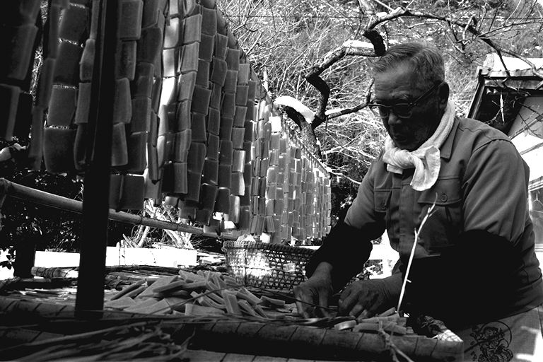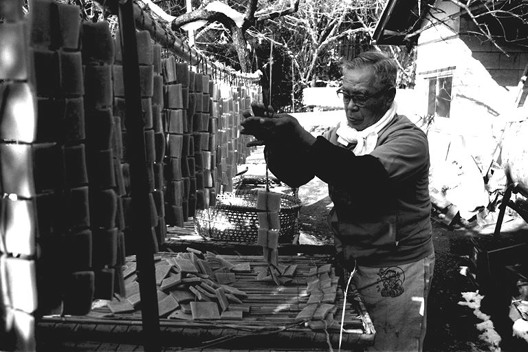 「今になってみりゃあ、わしの生きがいでね…」と語る林さんは、今年でこの道41年目。年間を通して、豆腐と油揚げを作っており、12月末から翌年の2月後半あたりまで、凍み豆腐作りを行います。凍み豆腐について林さんは「昔、冬に食べ残しの豆腐を外に干し、保存食として食べていたのが、凍み豆腐の起こりだとも聞きます」と。 凍み豆腐作りは、とにかく天候が相手の作業。早朝の気温がマイナス5度以下に安定してこないと、上手に出来ないとのこと。堅く絞った豆腐を夕方小さく切り分け、外に干します。翌朝、凍った豆腐を1つずつわらで結んで束ね、更に数日干すと出来上がり。「今どき、こんなめんどうな仕事をやる人、ほとんどいないんじゃないかな」と林さん。