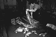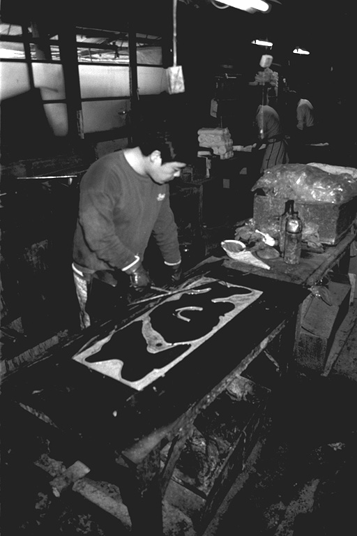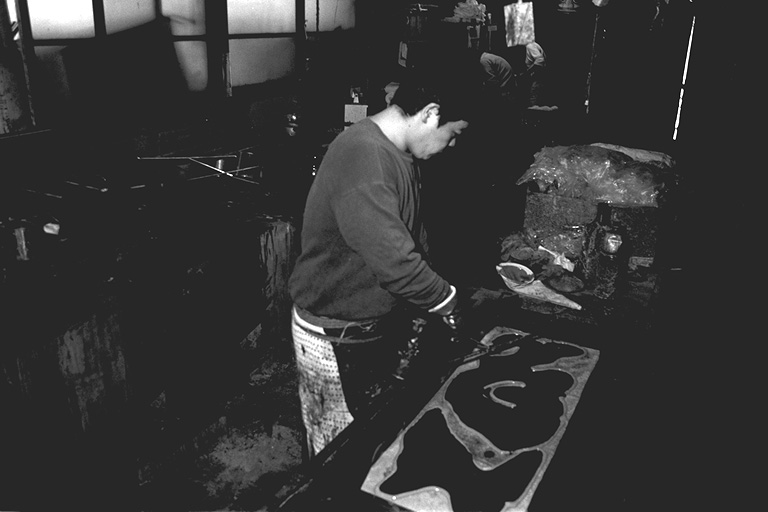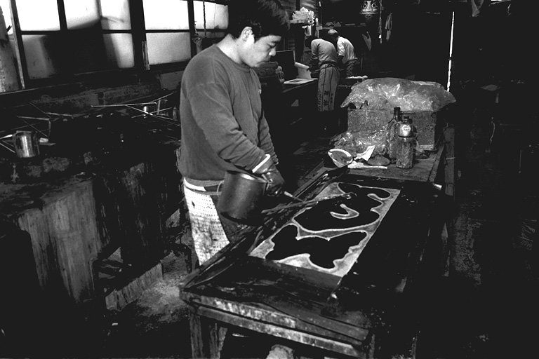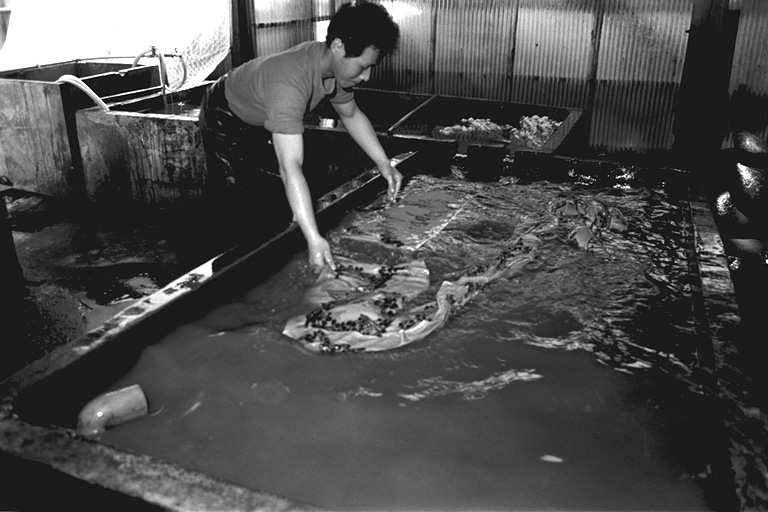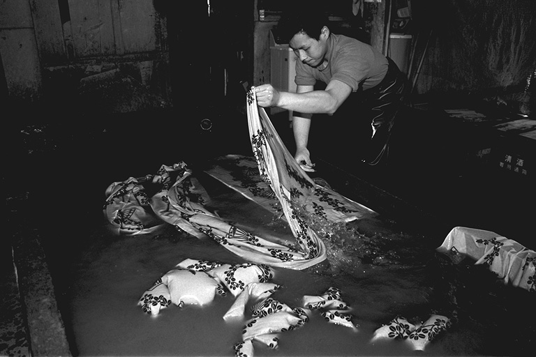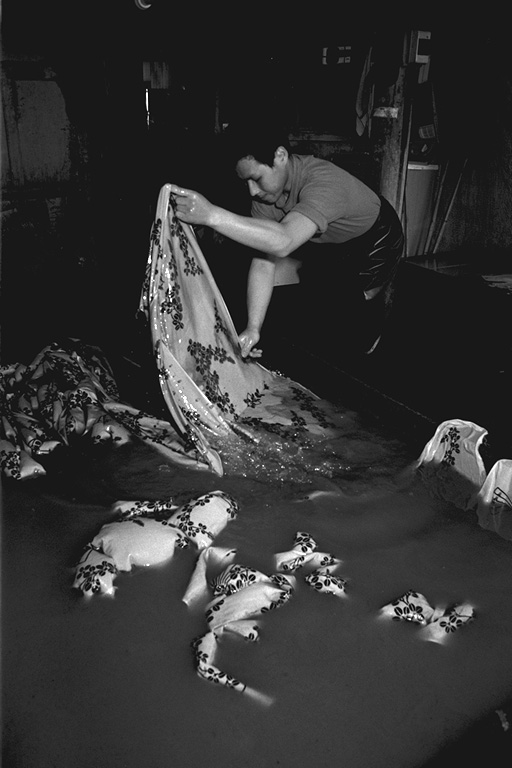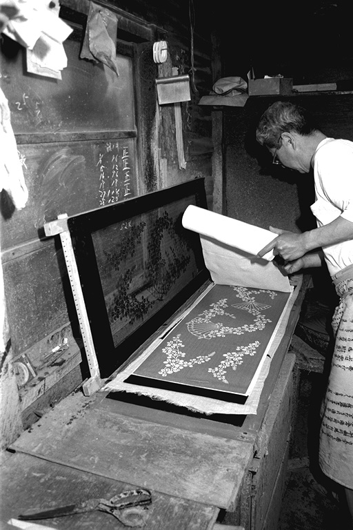作業場は、型紙を作る「型彫り」、海草とベットナイトという砂を混ぜたのりを型紙に塗り込む「のり付け」そして「染め」、のりを水で洗い落とす「水洗い」といった仕事が専門の職人によって分業化されています。特に「のり付けは長年の経験と高度な技術が必要」と春原さん。また、作業のほとんどが職人の手仕事に頼っているので、「機械化は難しい」とも。