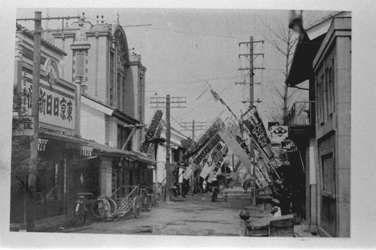 当時は、この通りを「常田町通り」と呼んでいましたが、紛らわしいということで、戦後「本町通り」に変えたいきさつがあるんです。電気館(現東映)は、テレビのない時代でしたので、唯一の娯楽として、郊外からもおおぜいの人が来ていました。終戦後に全焼、駅前で仮営業したことも…。また、商店ののぼり旗が懐かしいですね。