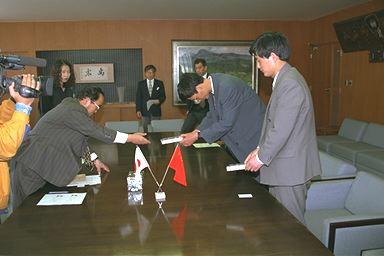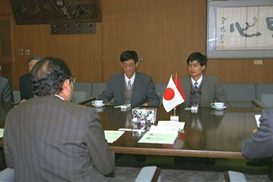 上田市との友好交流都市提携をした、中華人民共和国浙江省、寧波市から農業研修のために来日した研修生が、平成7年4月27日市長を表敬訪問。