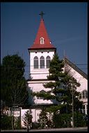 大手通り沿いにたつ上田新参教会は、明治30年に連歌町(現丸堀町の一部)でメソジスト上田教会としてスタート。同45年、教会堂を新築、昭和10年現在地に移転新築した。