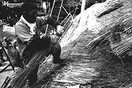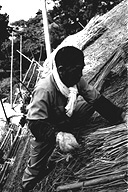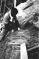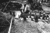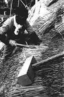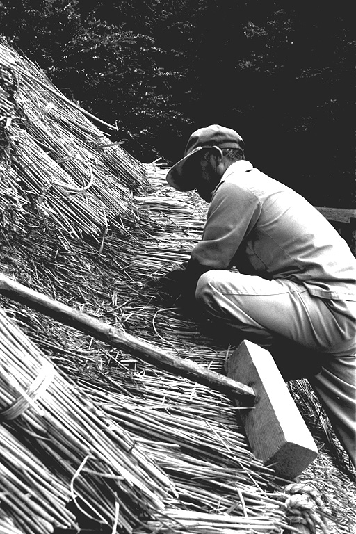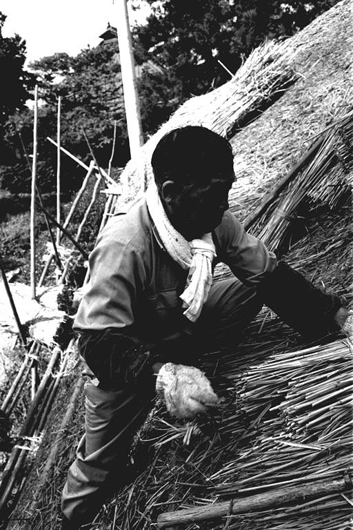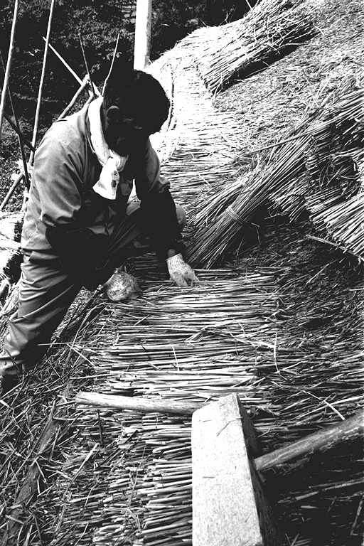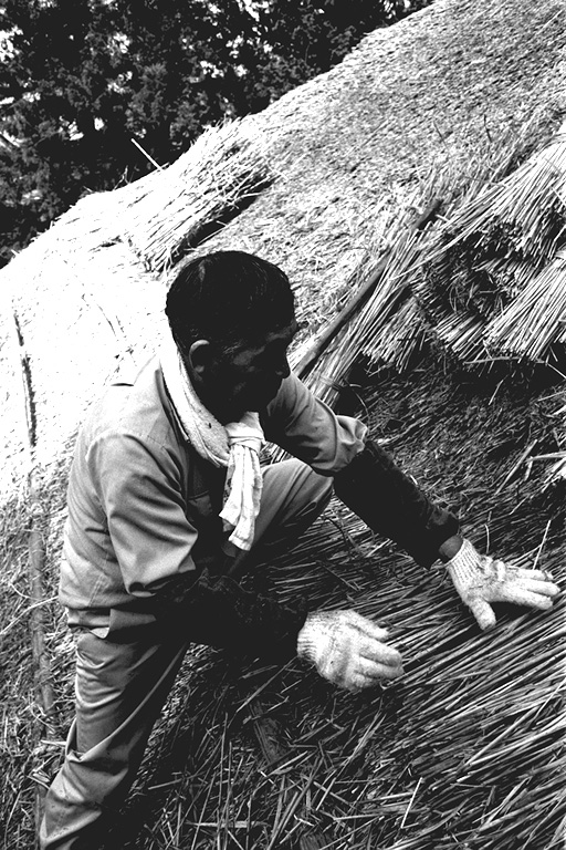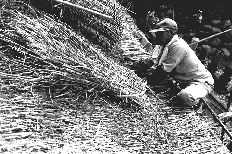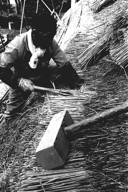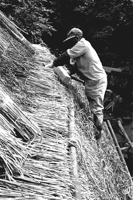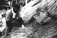 今は材料の「かや」自体が少なく、注文があっても、まず材料から集めなければなりません。「かや」は寒い所のものがじょうぶで、軽井沢産がよく使われます。内田さんは「かや葺き屋根は、夏涼しくて冬暖かい。昔の人の知恵ですなァ」と。そして「職人といえども、仕事中によく屋根から落ちましたわ」と照れくさそうに話す内田さん、これからも別の仕事の合間、かや葺きは続けるとのことです。