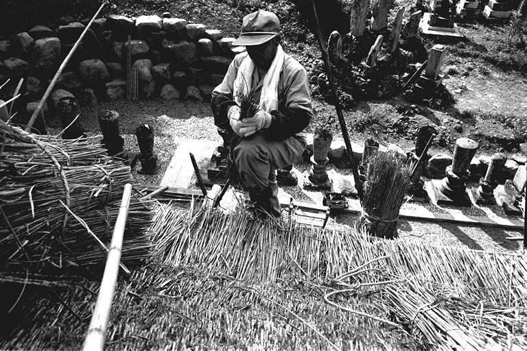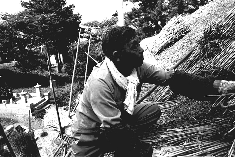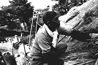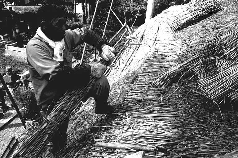 ここは塩田の中禅寺。県内最古の木造建築で、国の重要文化財にも指定されている「薬師堂」の、屋根の葺き替えが行われていました。この薬師堂の屋根は、創建当時の古さと重みを感じさせる「かや葺き」です。葺き替えの仕事に励む内田さんは、約二十六年間、寺院や個人の家を中心にかや葺きをやっています。「今は一年に三、四軒の仕事しかないから、だんだんやる人がいなくなっちゃって…」と語る内田さん。以前は五十〜六十人の職人がいたそうです。