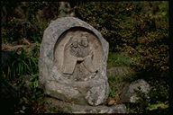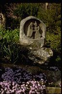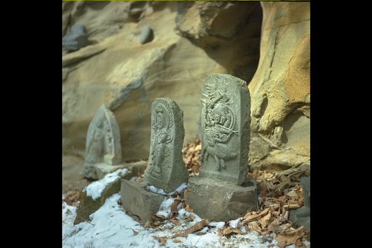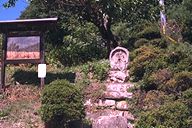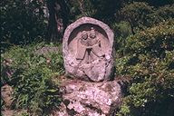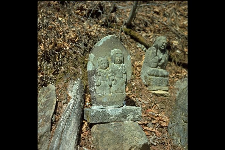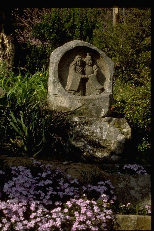 のどかなたたずまいをみせる野倉の里、咲き乱れる野の花々にかこまれたかわいらしい道祖神が仲よく手を握って立っている。