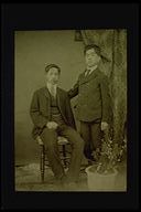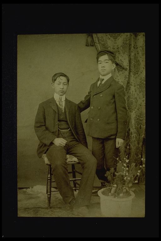 この写真は渡米した直後に撮ったと思われる記念写真で右がシゲタ。原町で幼なじみだった宮下唯由さんあてに送ってきた一枚で、表面には自筆の名前が見られる。(写真提供=宮下力さん)
