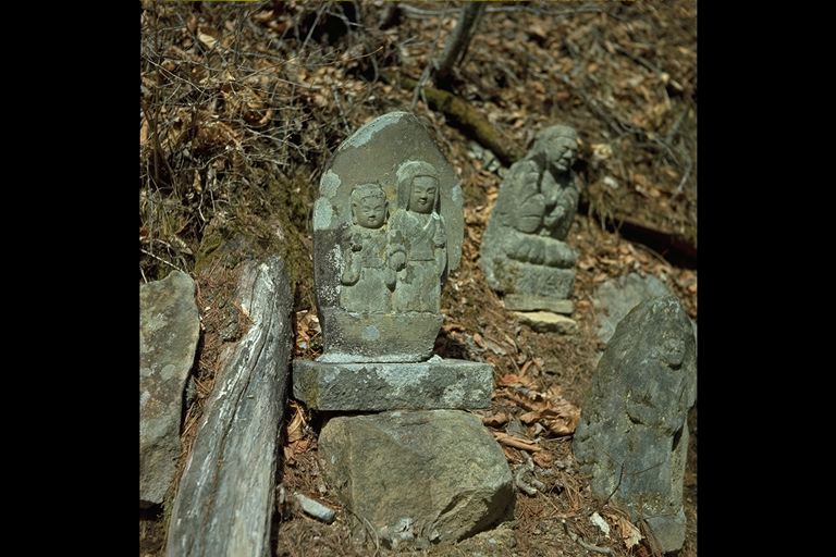 小県郡と東筑摩郡の郡境、修那羅峠から山道を20分ほど歩くと安宮神社に着く。神社の裏山は石仏・石神の宝庫である。昼なお暗い林の中に八百体におよぶ石像がならぶ。(青木村)